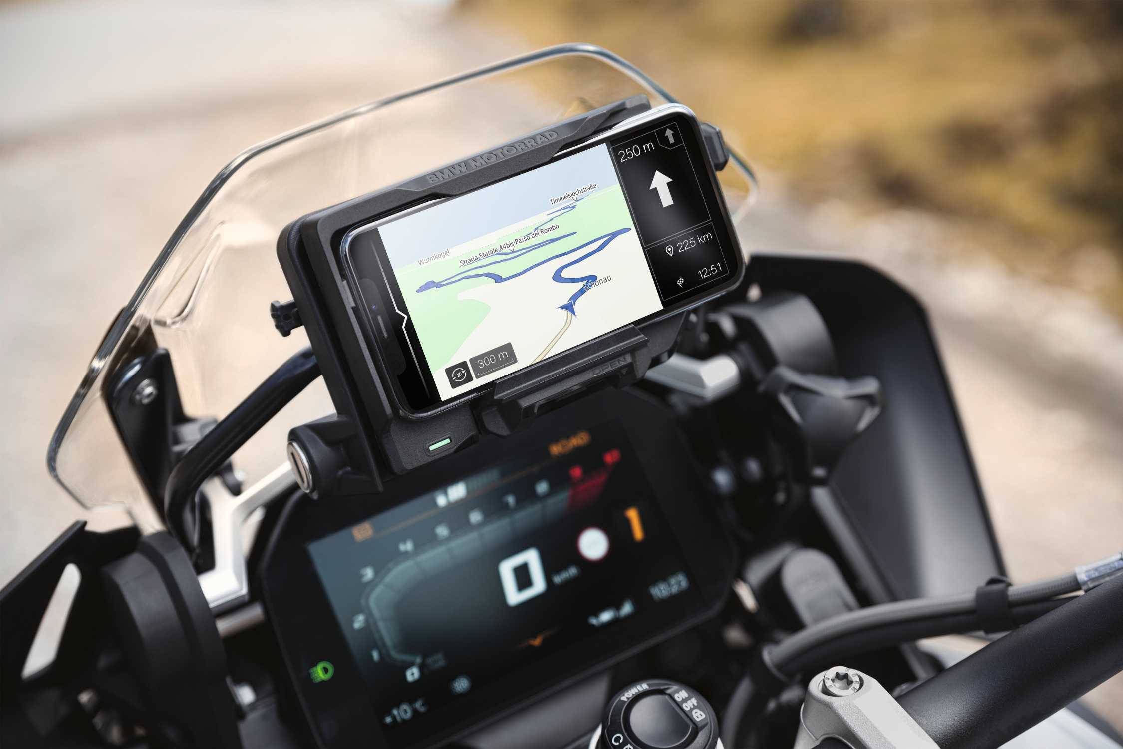 Das BMW Motorrad ConnectedRide Cradle ist die ideale Lösung für Motorradfahrer, die ihr Smartphone als Navigationsgerät nutzen möchten. Mit der BMW Motorrad Connected App können Navigationskarten und Fahrzeugdaten direkt im Sichtfeld angezeigt und über den Multi-Controller oder das Tastenfeld des Motorrads bedient werden.